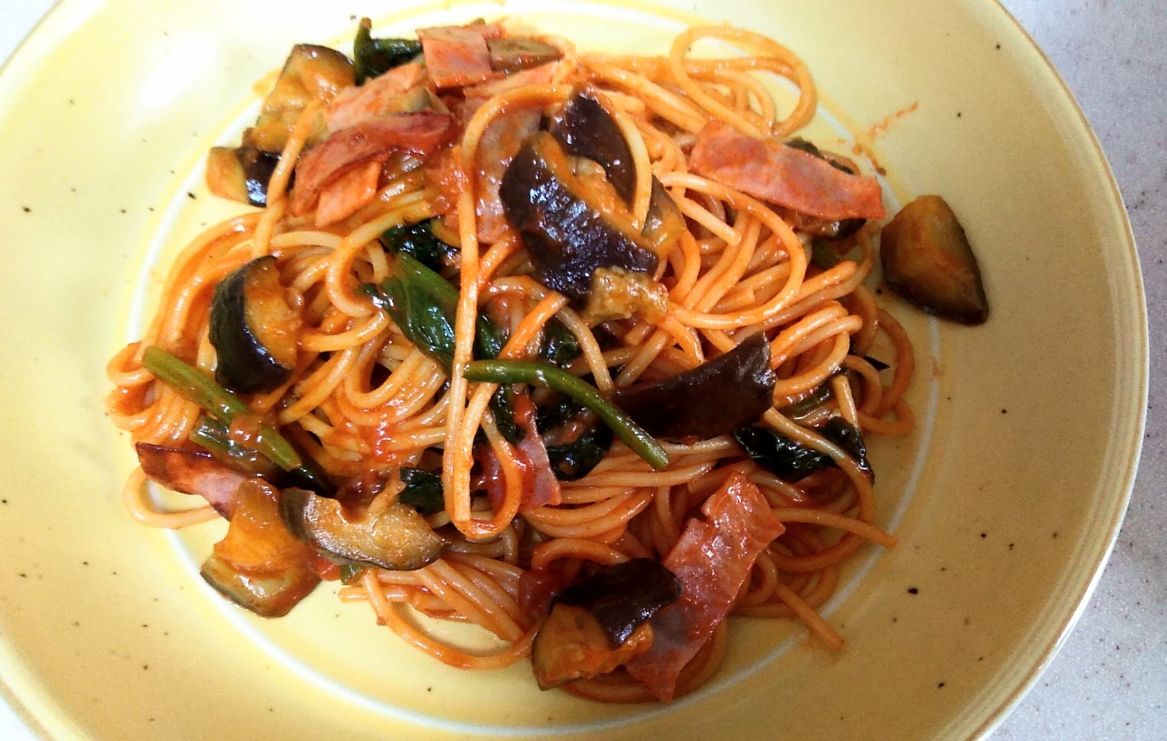 ベーコンとなすのナポリタン サンシャイン
